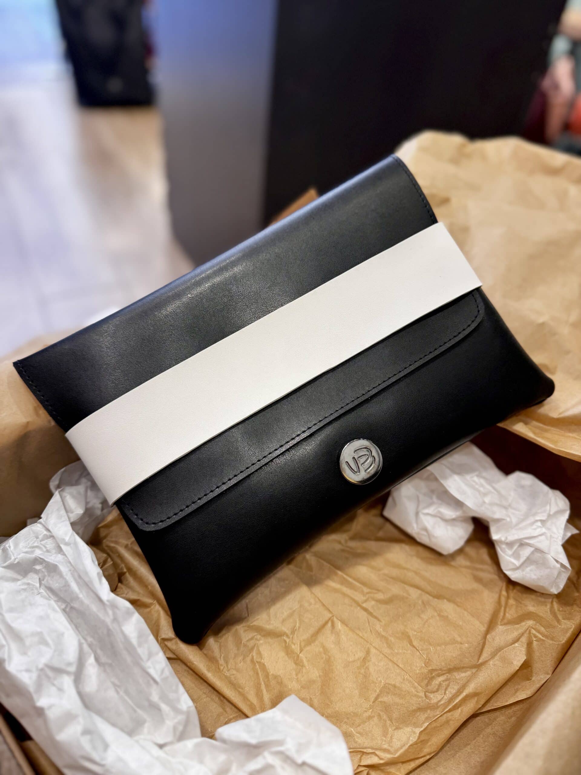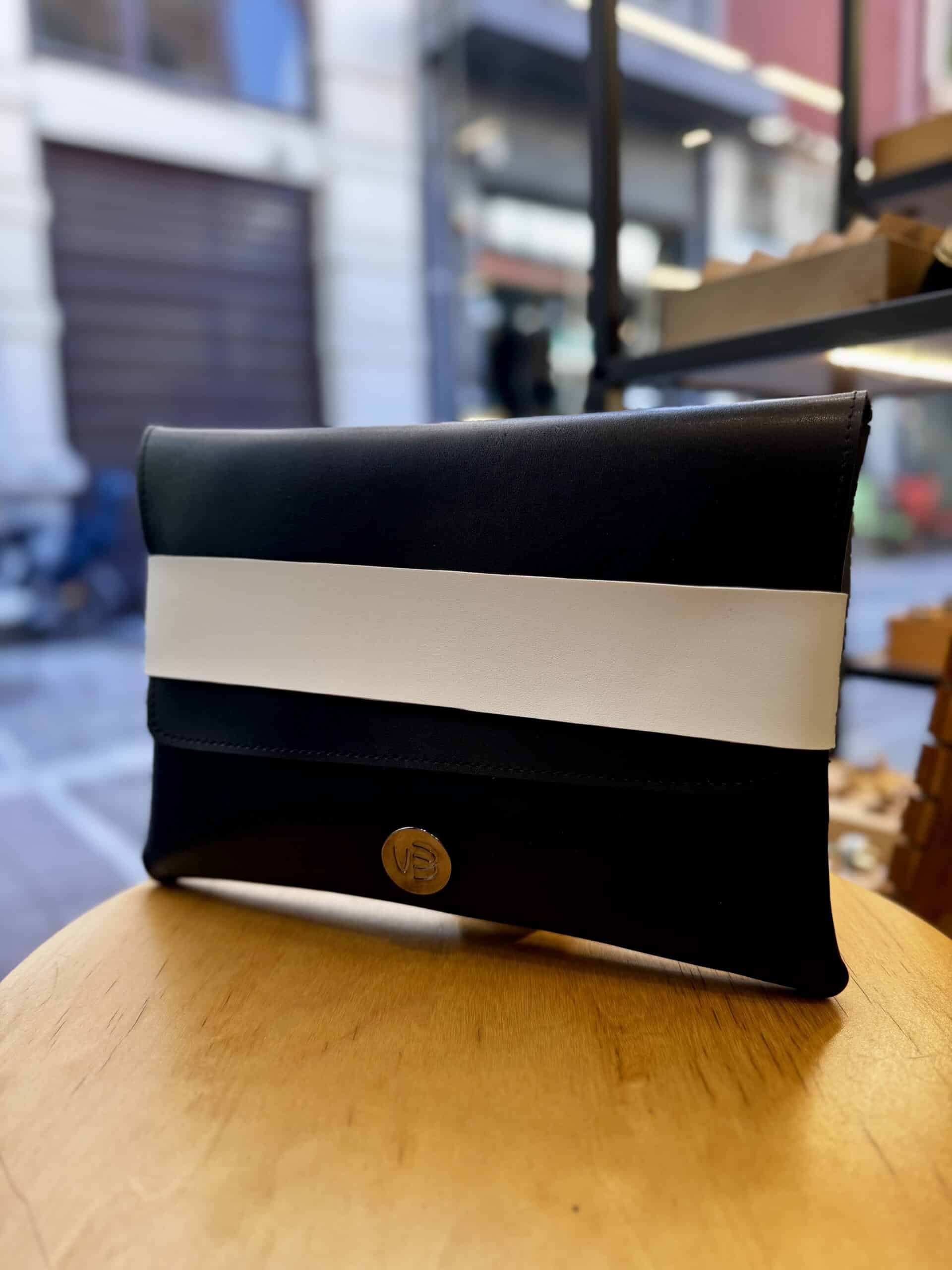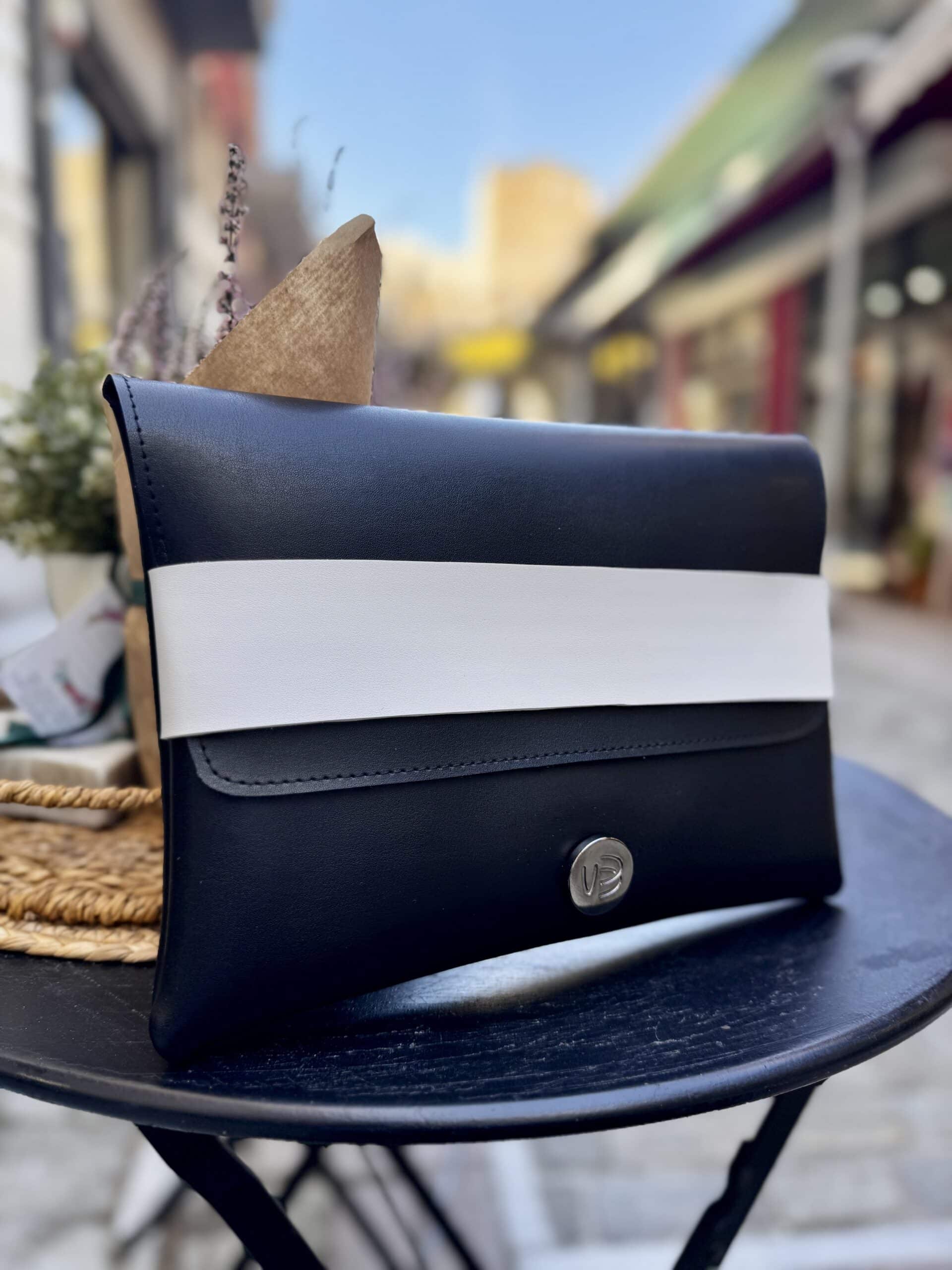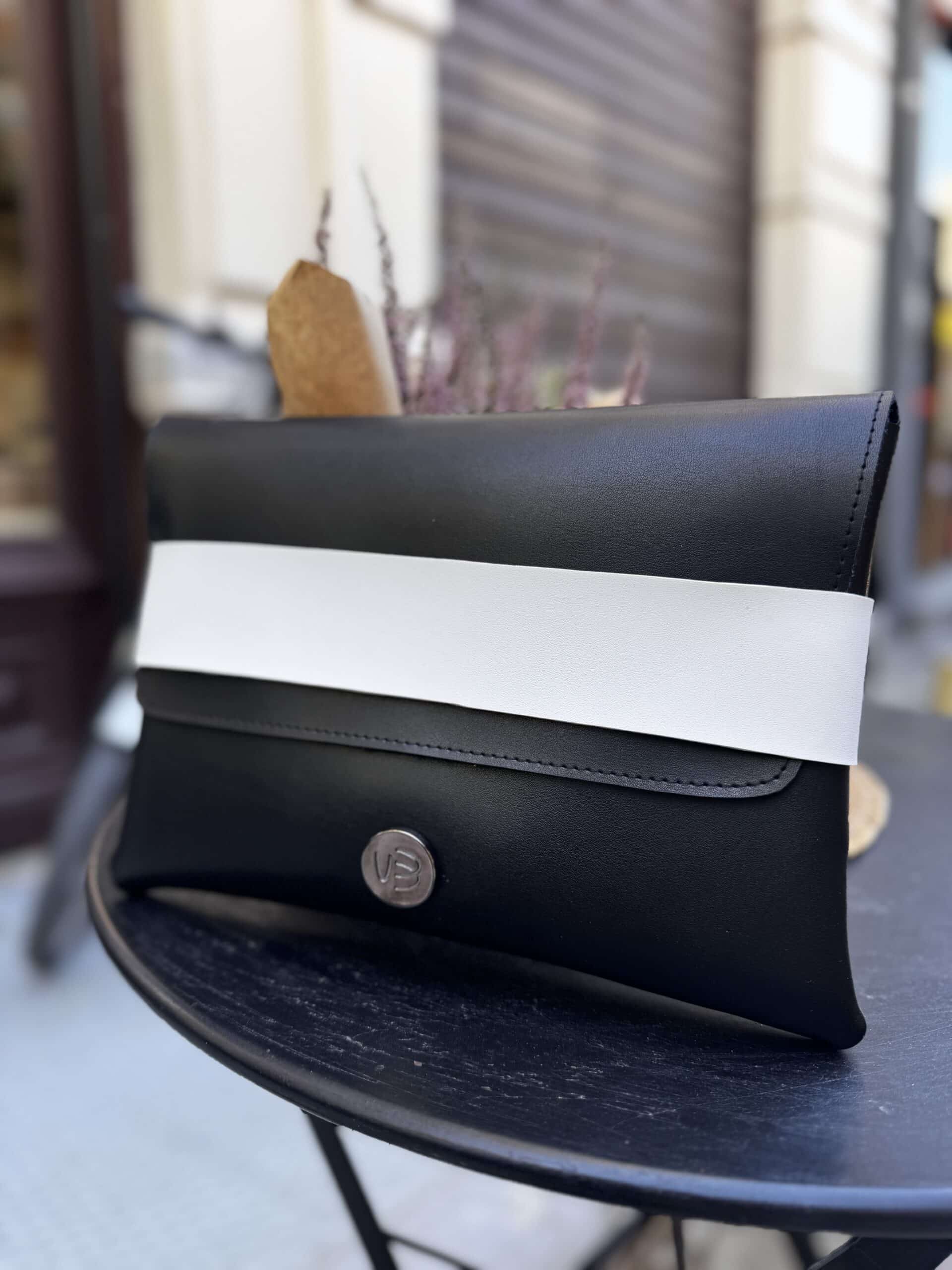 Αναδείξτε το στυλ σας με αυτόν τον κομψό, χειροποίητο φάκελο σε ασπρόμαυρη απόχρωση. Κατασκευασμένος από υψηλής ποιότητας τεχνόδερμα, διαθέτει καπάκι και εσωτερικό τσεπάκι που προσφέρουν πρακτικότητα και άνεση στη χρήση.